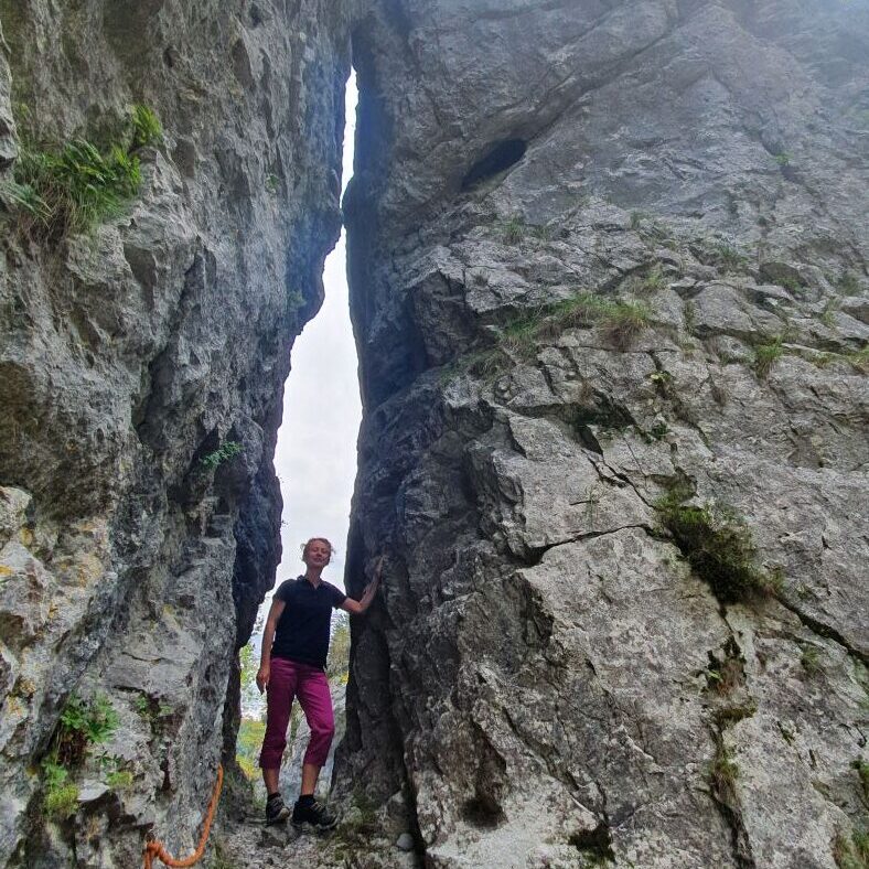 V skali zagledaš prvi obraz, ki mene spominja na vesoljca. Nekaj korakov naprej prideš do ‘igle’ – 40 metrov visokega skalnega osamelca, ki ga od matične stene loči ozka, dva metra široka razpoka. Stara pot je vodila prav skozi to razpoko. Ko vstopiš vanjo, čutiš moč zraka, vetra, ki drsi skoznjo. Legenda pravi, da je v dolini živela ajdovska deklica, tako velika, da je z eno nogo stala na Raduhi, z drugo pa na Veži. Ko je nekega dne šivala srajco, se ji je v grobem platnu zlomila igla. Razjezila se je in jo vrgla v dolino, kjer se je zapičila v breg in ostala tam do danes.