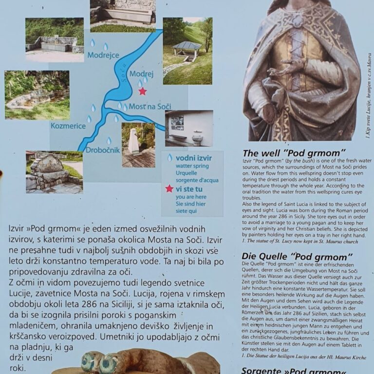 - izvir “Pod grmom” blizu Mosta na Soči naj bi imel zdravilno vodo za oči. Tam okoli je kar nekaj takih izvirov, kot jih označuje informativna tabla.